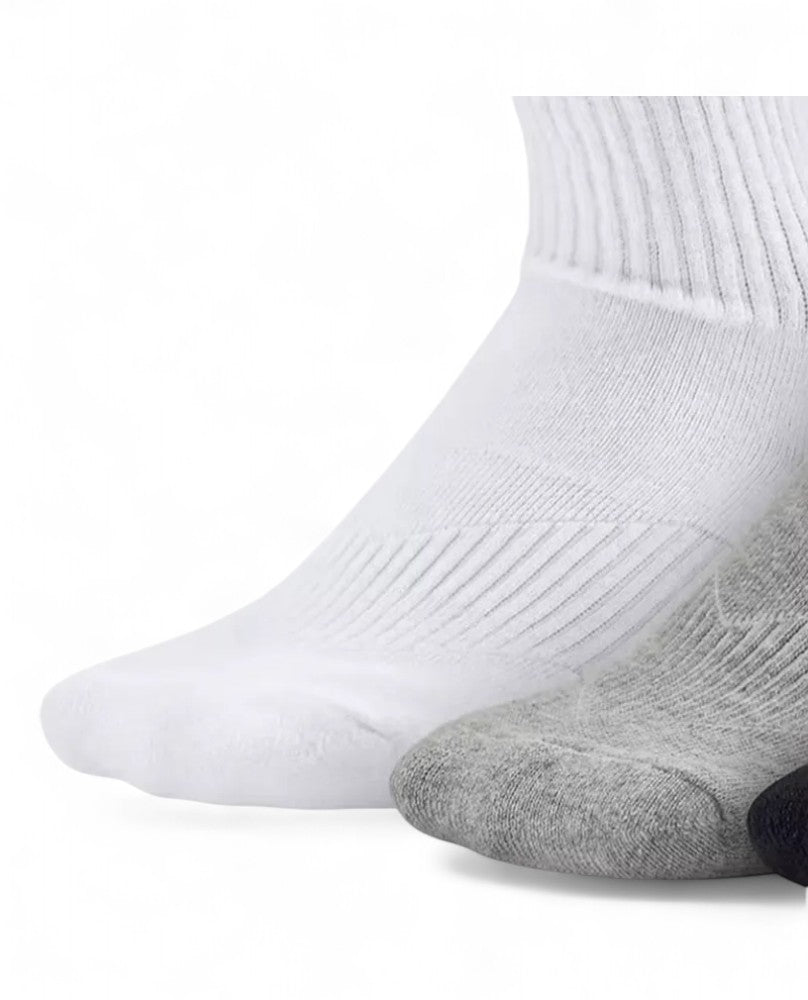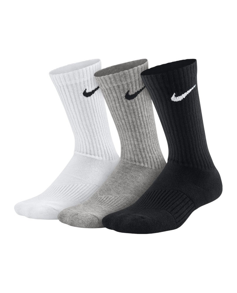 COMODIDAD Y APOYO. Con soporte de arco esculpido y una mezcla de tela que absorbe el sudor, los calcetines Nike Cotton Cushion Crew Junior paquete de 3 en negro/gris/blanco - SX4719-967 te ayudan a mantenerte cómodo y seguro. La tela que absorbe la humedad mantiene los pies secos y cómodos. Puños acanalados para un ajuste óptimo. El talón y la puntera reforzados proporcionan una protección confiable en las áreas sujetas a mayor desgaste. Soporte de arco para un ajuste seguro. Lavado a máquina; 3 pares.